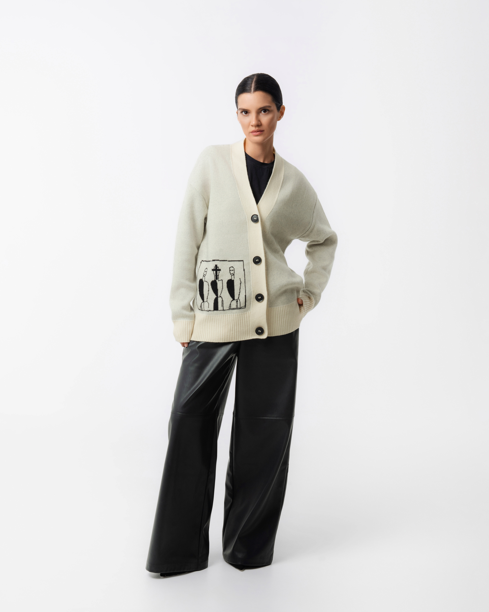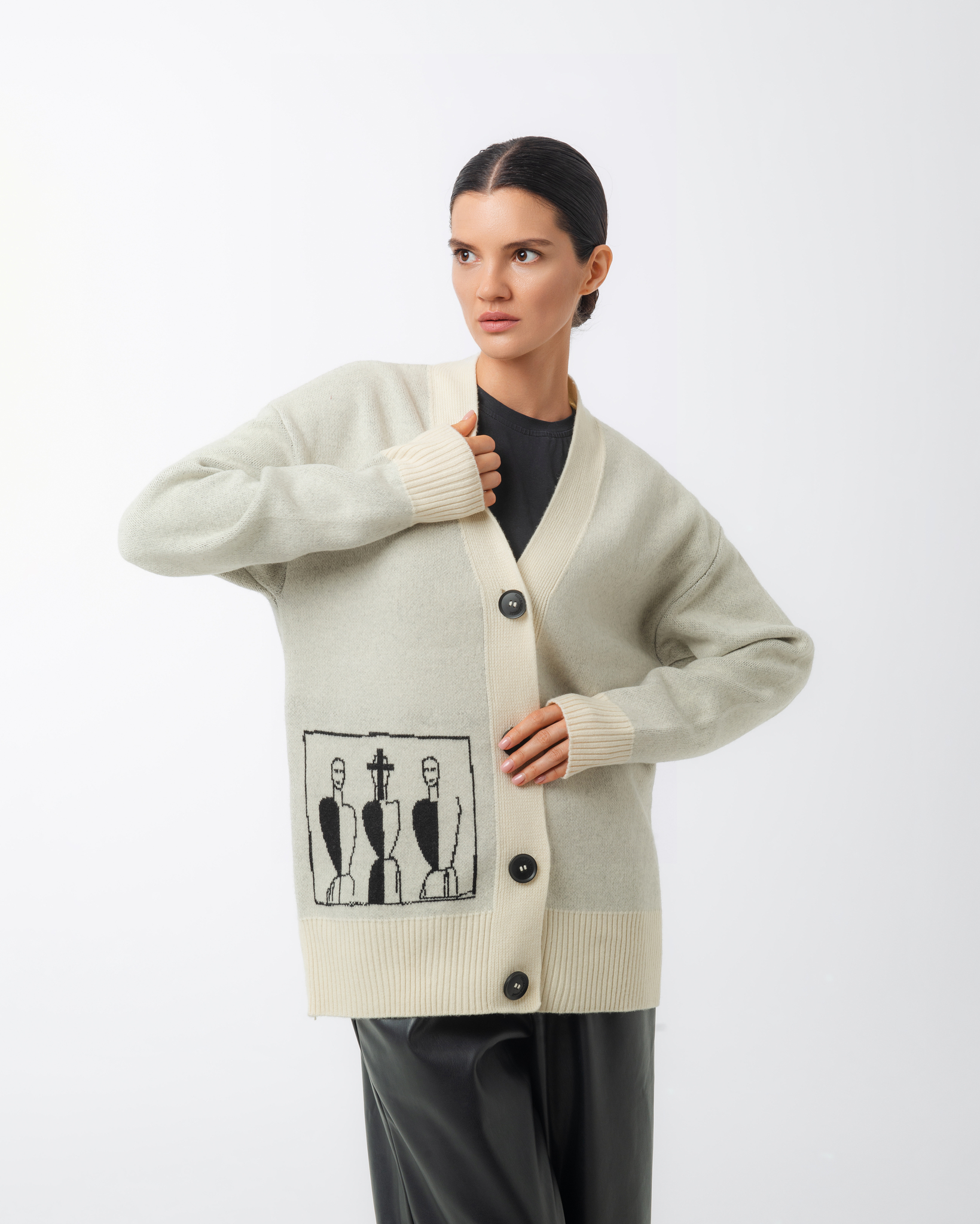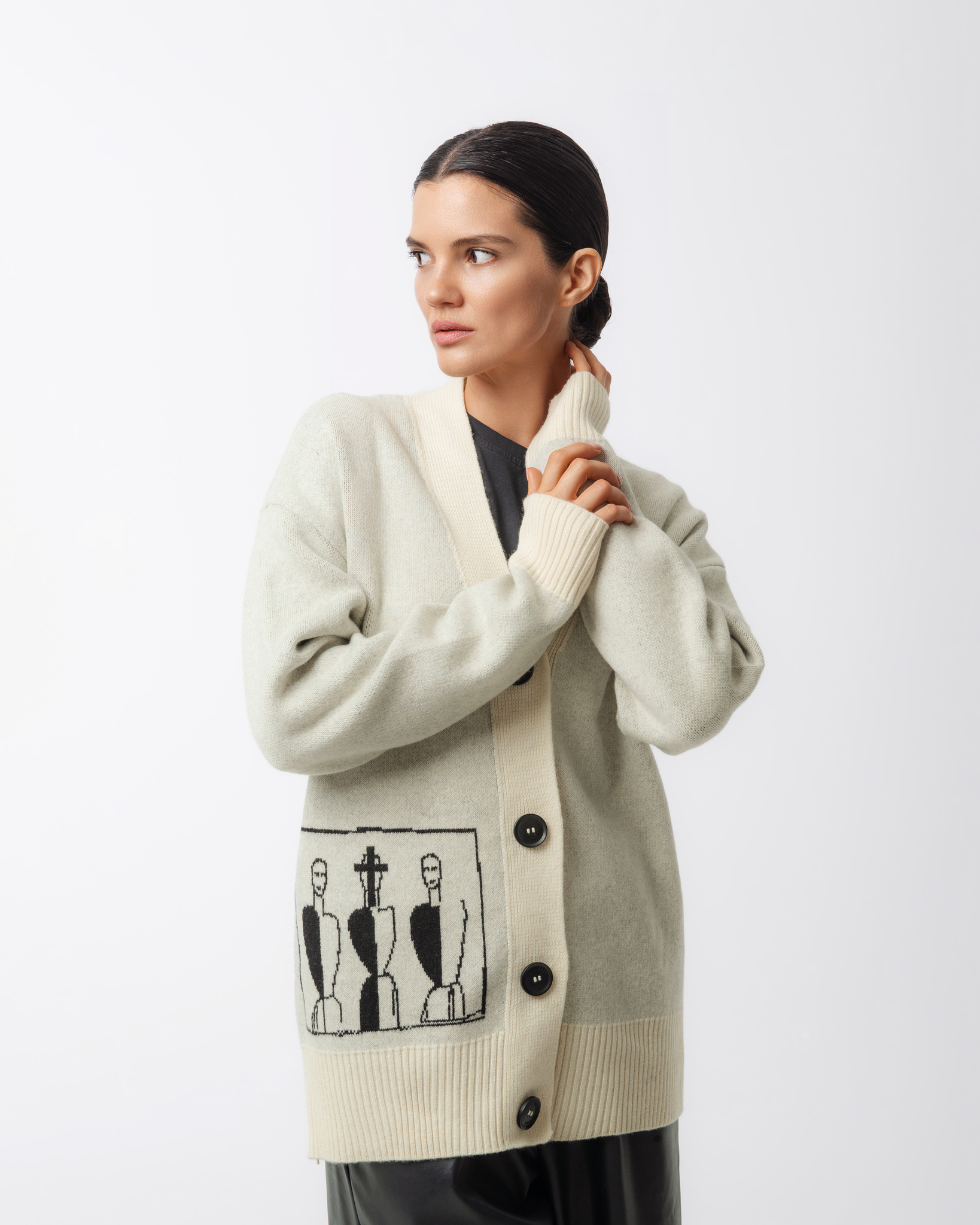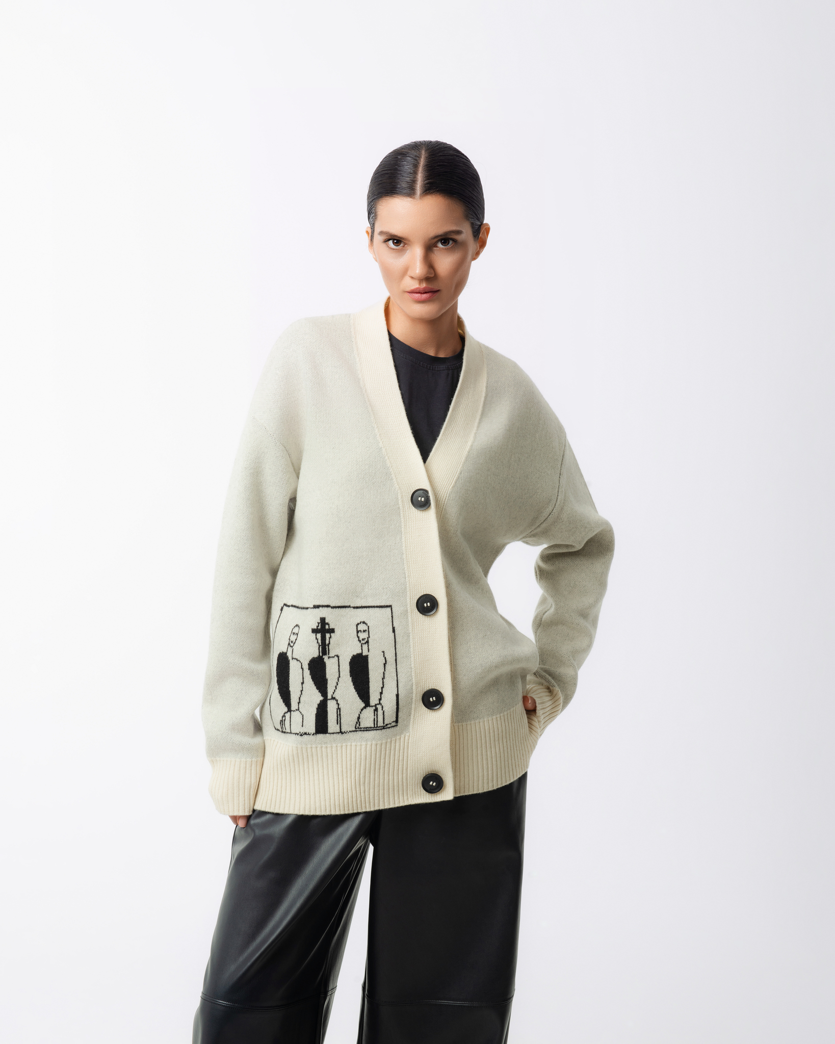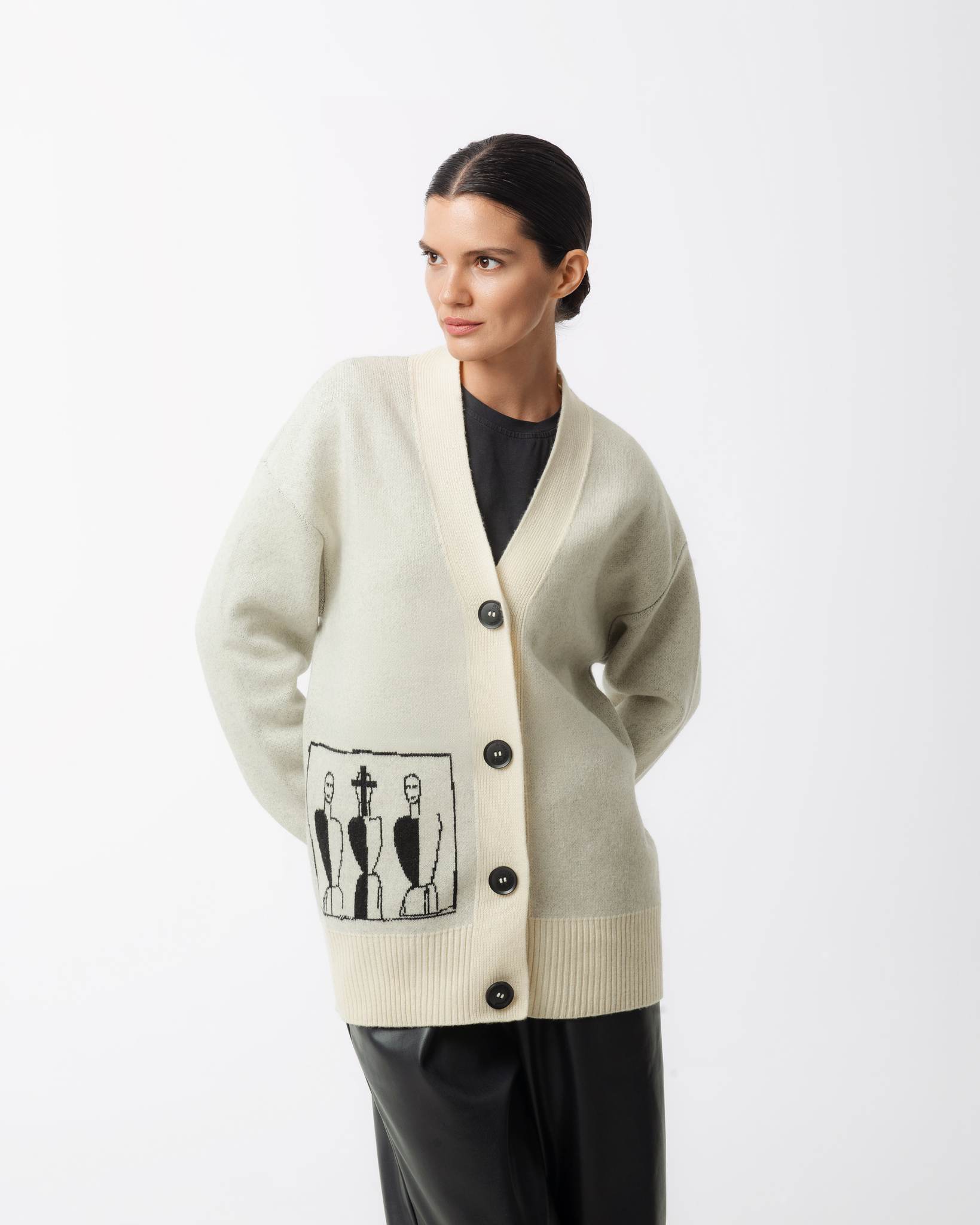 Кардиган «ПОСВЯЩЕННЫЕ» — это стильный и элегантный предмет гардероба, который станет настоящим украшением любого образа. Вдохновением для создания кардигана послужил «Чёрный квадрат» Казимира Малевича — символ авангардного искусства и простоты форм.