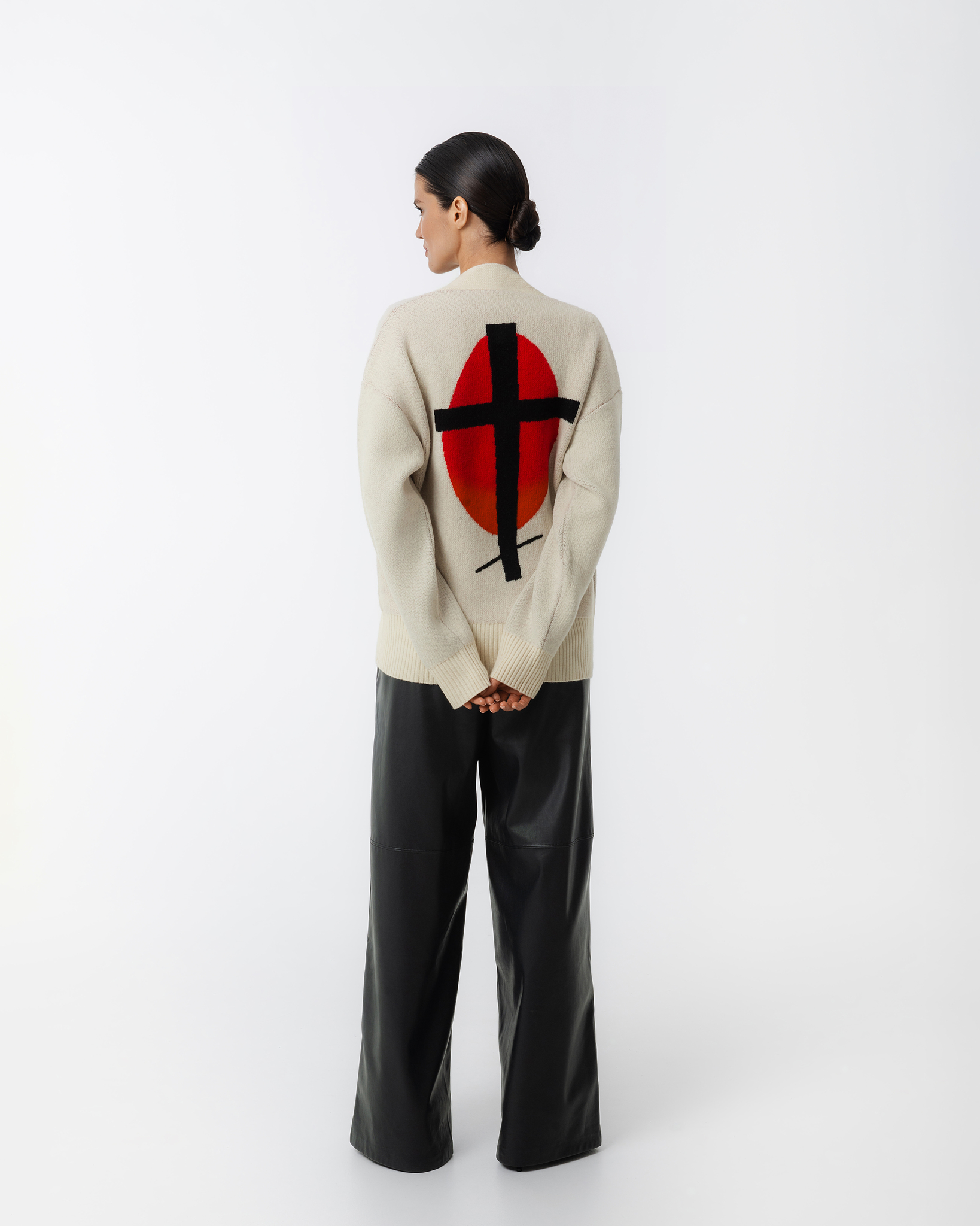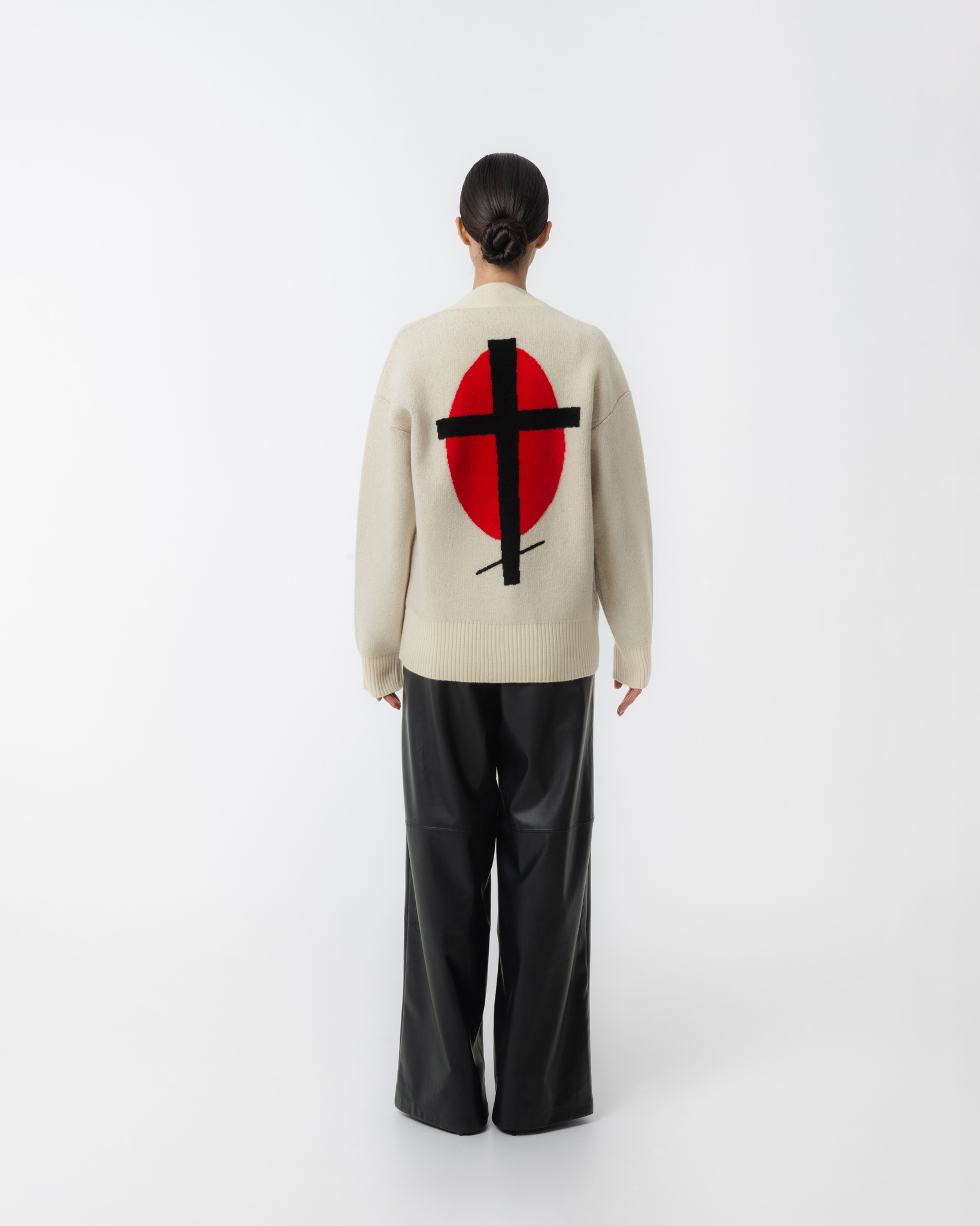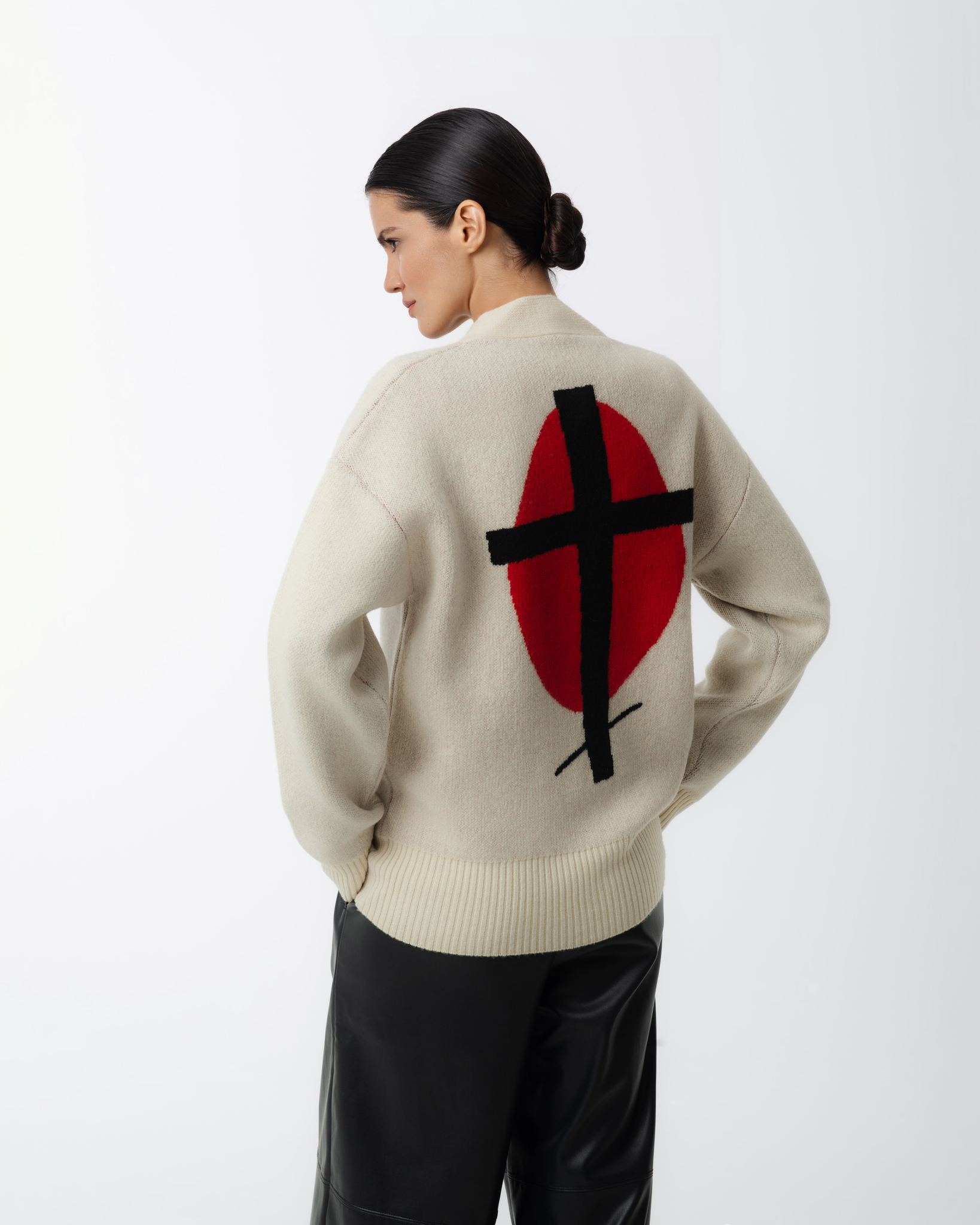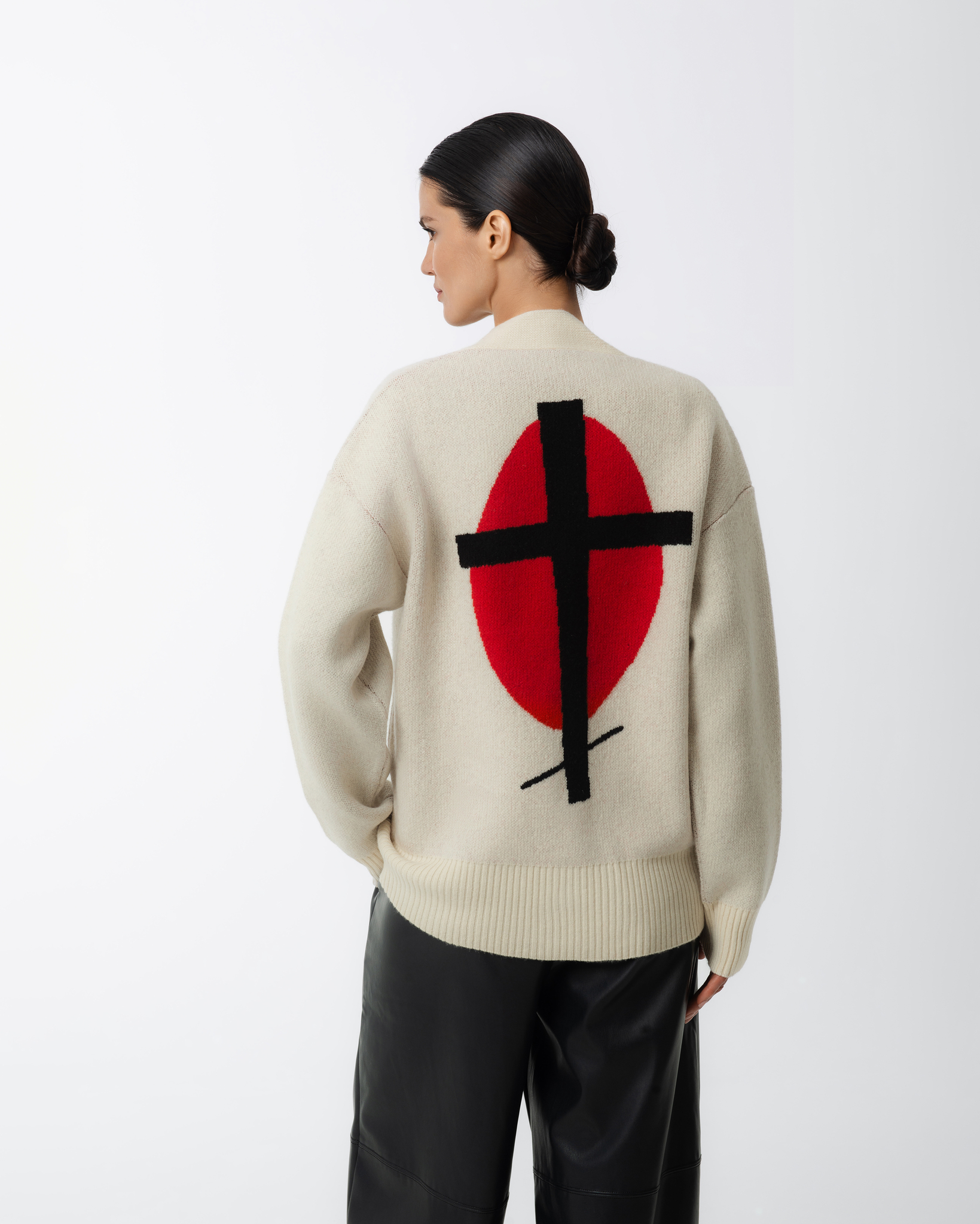 Кардиган «ПОСВЯЩЕННЫЕ» — это стильный и элегантный предмет гардероба, который станет настоящим украшением любого образа. Вдохновением для создания кардигана послужил «Чёрный квадрат» Казимира Малевича — символ авангардного искусства и простоты форм.
