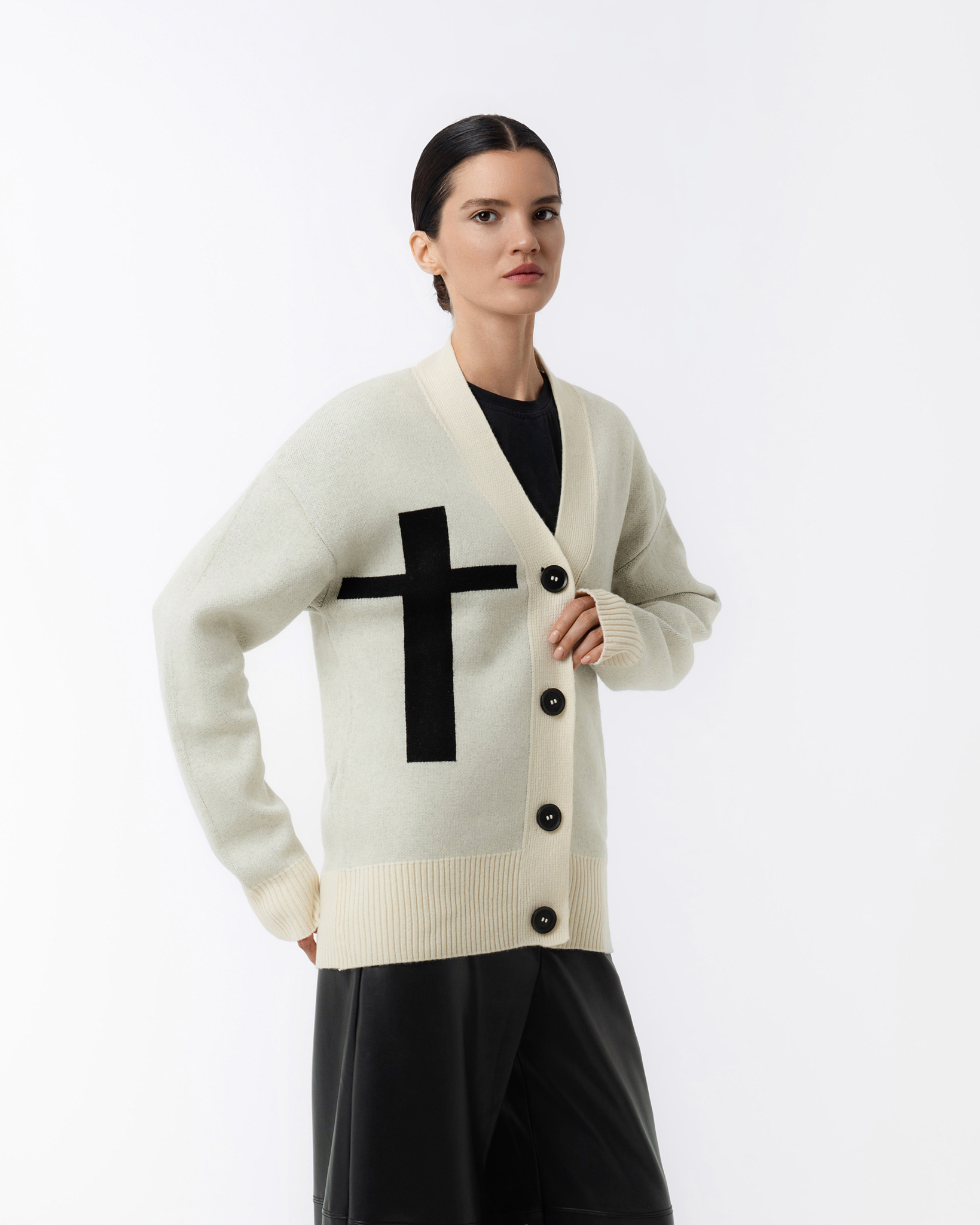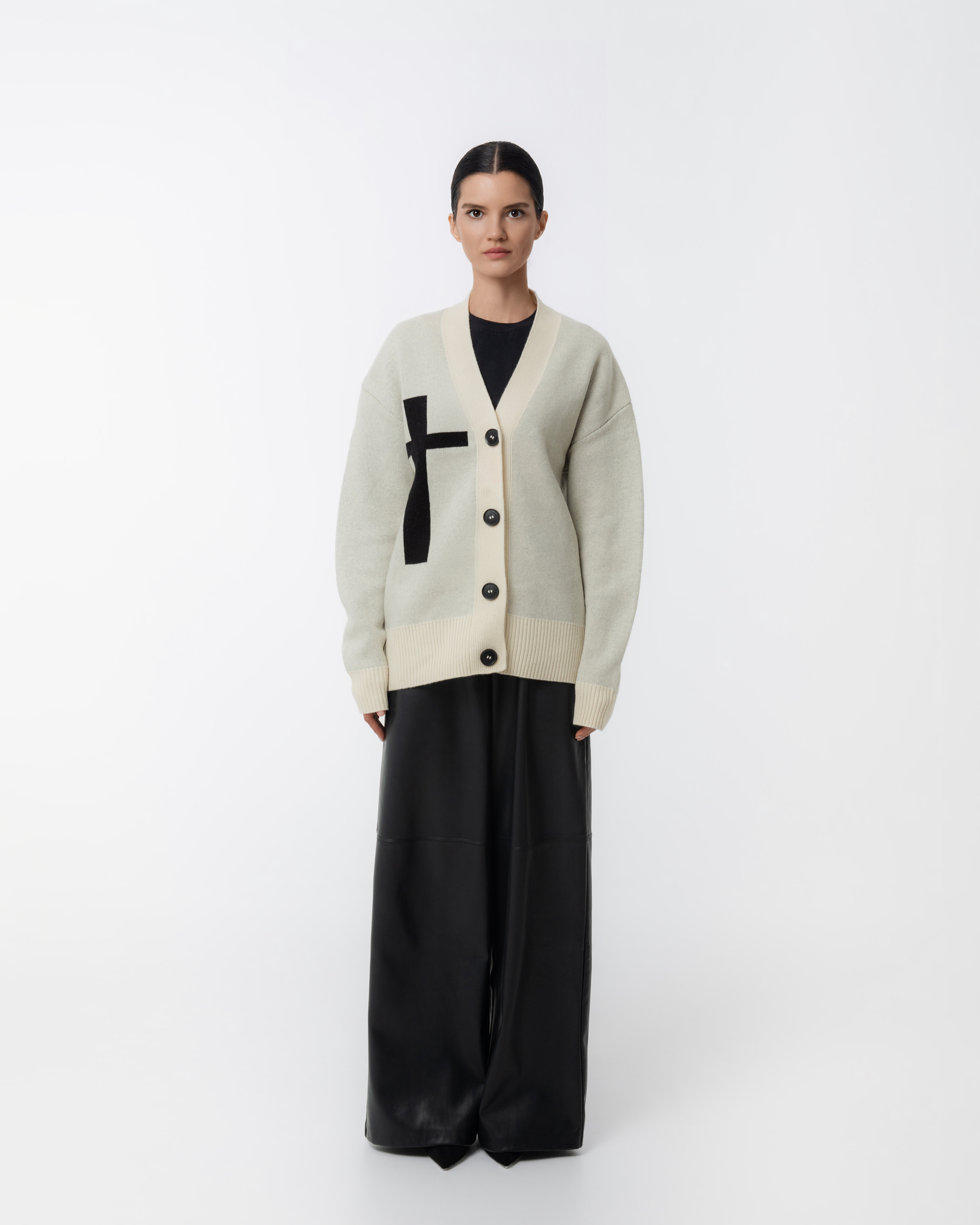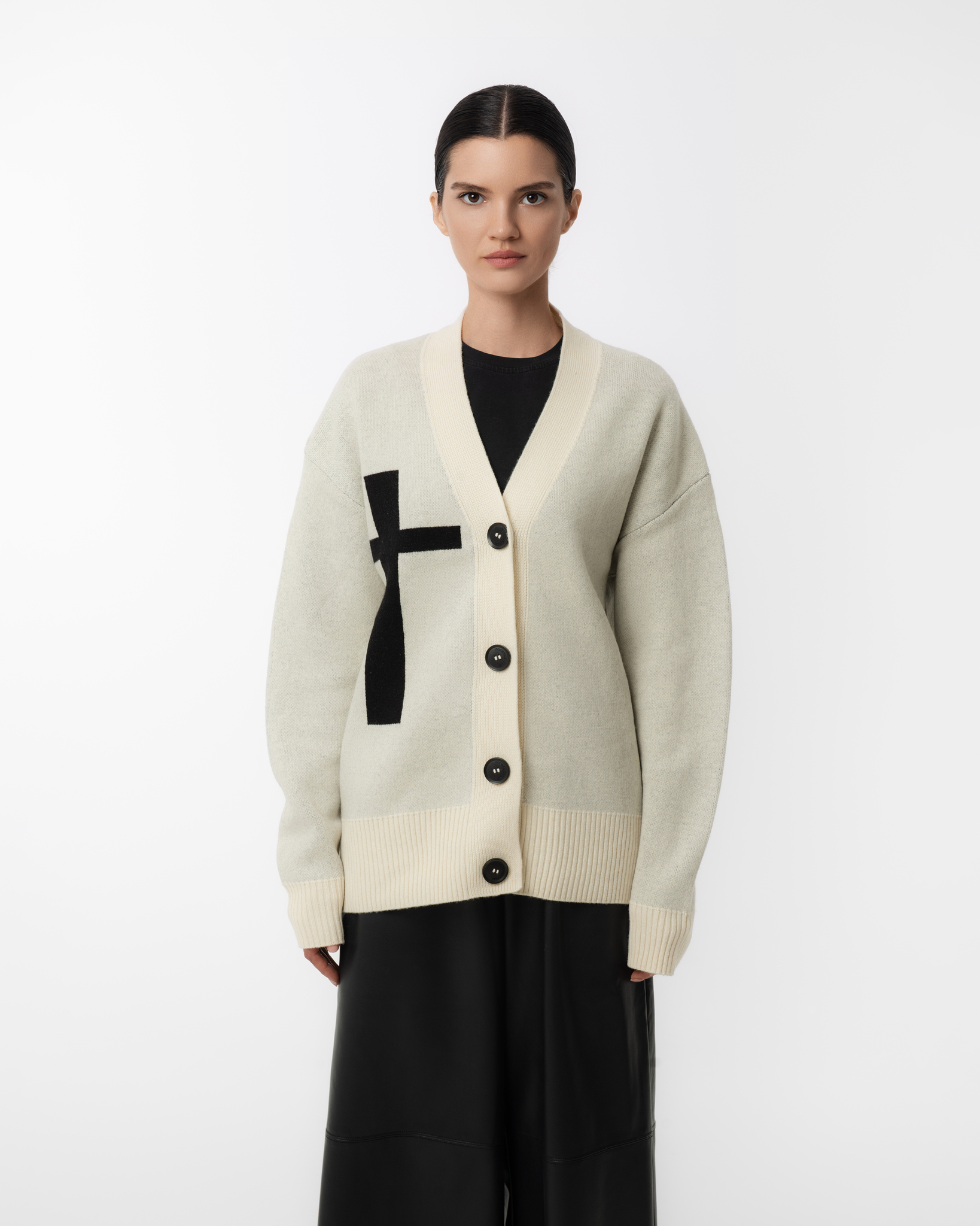 Кардиган «ПОСВЯЩЕННЫЕ» — это стильный и элегантный предмет гардероба, который станет настоящим украшением любого образа. Вдохновением для создания кардигана послужил «Чёрный квадрат» Казимира Малевича — символ авангардного искусства и простоты форм.