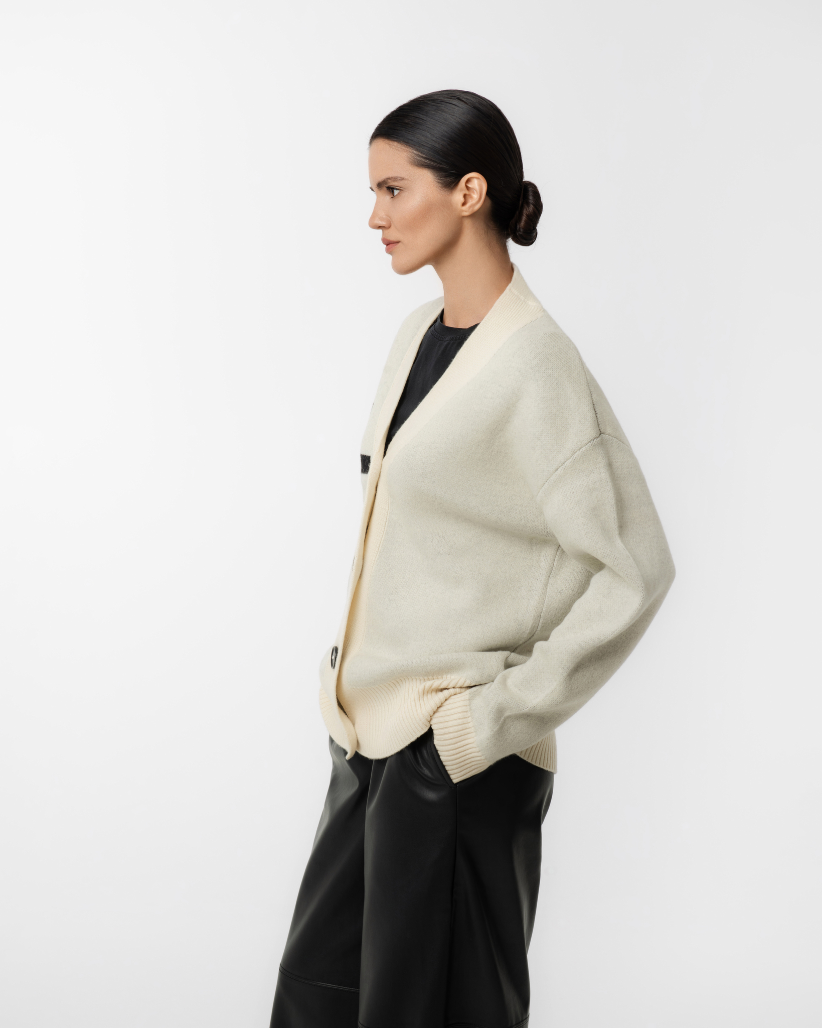 Кардиган выполнен из премиальной шерсти и кашемира, который обеспечивает максимальный комфорт и тепло. Дизайн кардигана — это сочетание простоты и элегантности. Чёрный цвет, чистые линии и минималистичный дизайн создают стильный и современный образ.