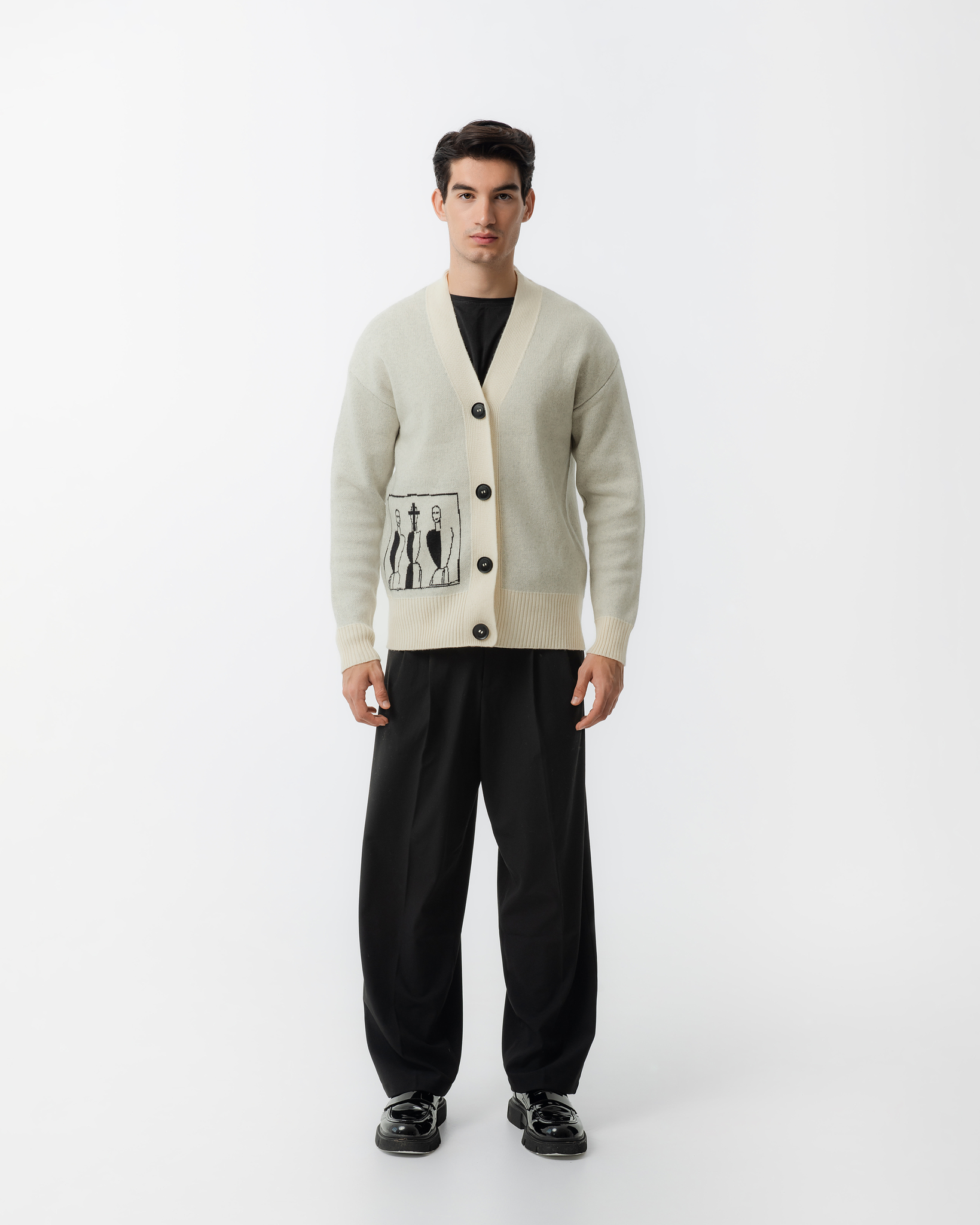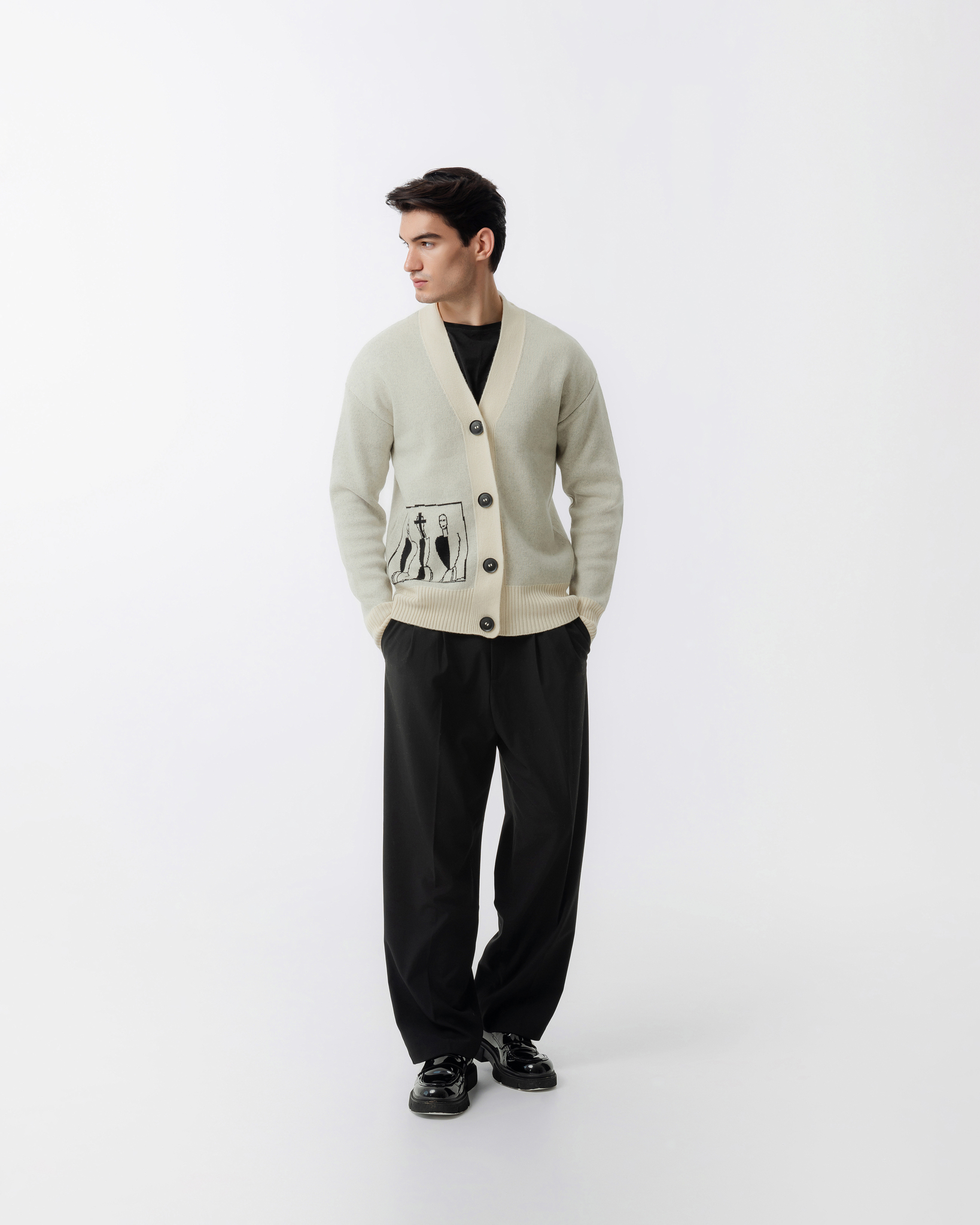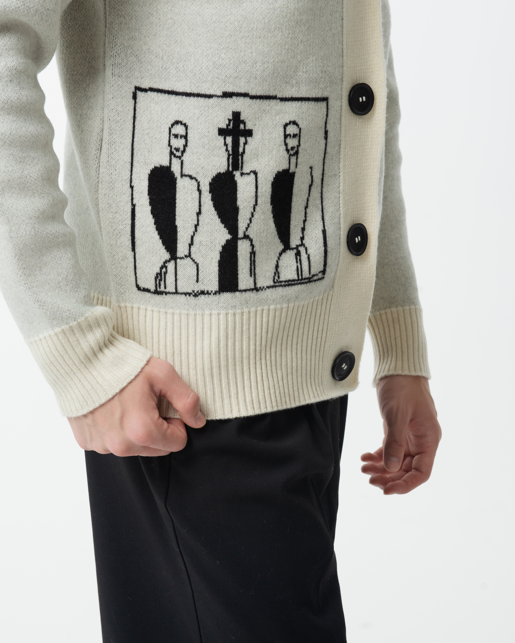 Кардиган «ПОСВЯЩЕННЫЕ» — это стильный и элегантный предмет гардероба, который станет настоящим украшением любого образа. Вдохновением для создания кардигана послужил «Чёрный квадрат» Казимира Малевича — символ авангардного искусства и простоты форм.